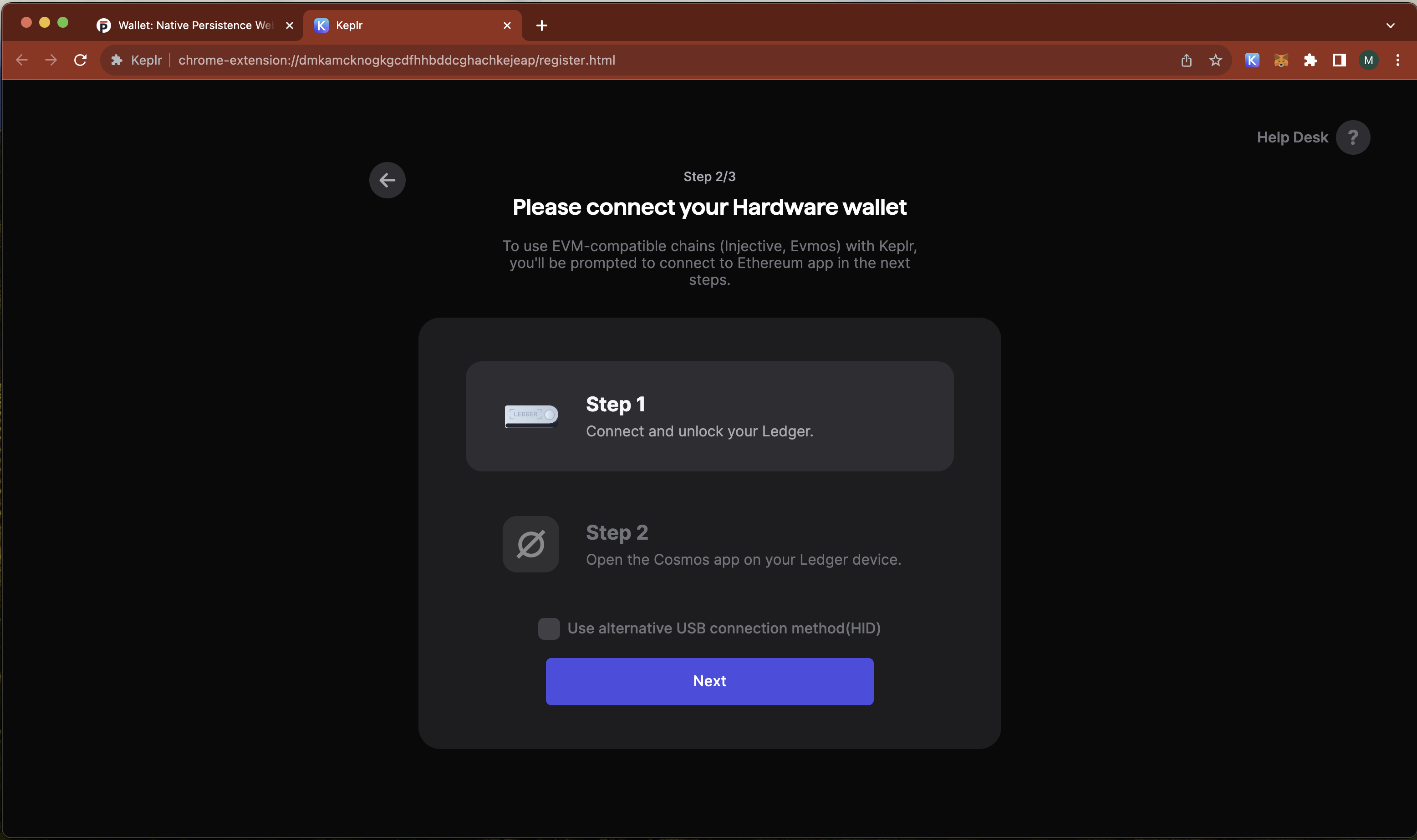 In this step we will import your ledger into keplr so that you can access your 118 coin-type wallet address.