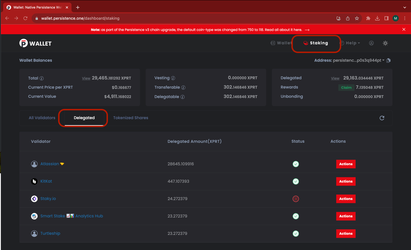 A. Go to 'Staking' page and select 'Delegated' from the sub-menu