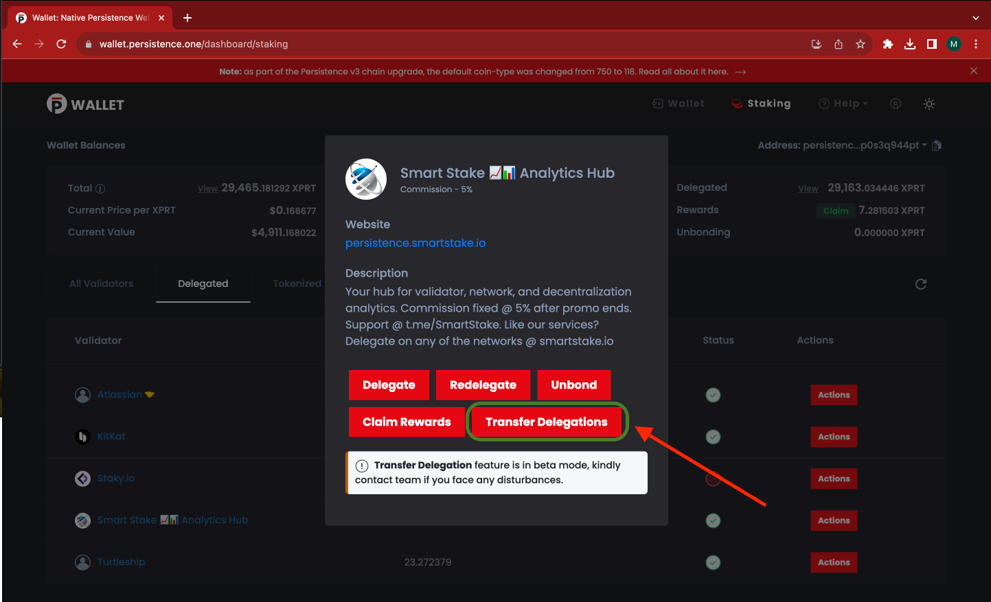 ⚠️ Warning: Note: If your validator doesn't have enough capacity, ask your validator to increase it or redelegate your staked/delegated tokens to a validator which has enough capacity for your tokens.